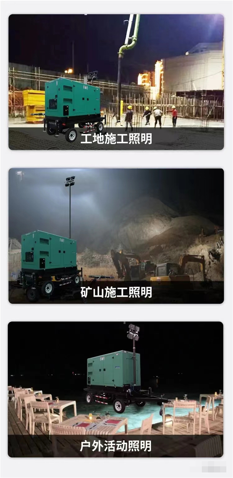 各種夜間作業如大型施工、工程搶修、災情搶險、消防照明、警案現場、交通拯救、事故處理和廣告拍攝等場合,滿足了現場對大面積、高亮度照明的需求。